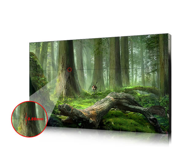 0.88mm液晶拼接屏是目前全球范围内仅有的一款双边拼缝在1mm以下的液晶面板,目前有46、55寸一种规格。55寸0.88mm拼接屏的单屏长宽为1210.51*681.22mm,分辨率依然为单屏1920*1080,其余参数如对比度、响应时间等均与常规55寸的产品相同。